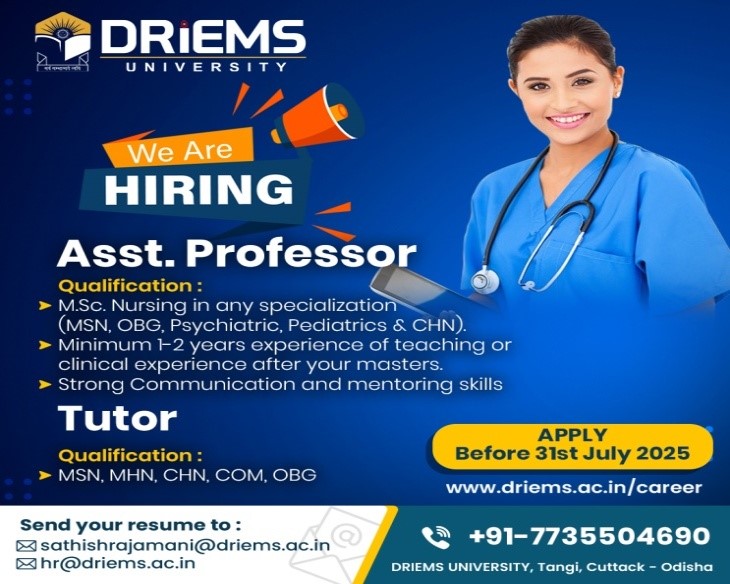 Advertisement for recruitment of the post of Assistant Professor and Tutor for School of Nursing (SON), DRIEMS University