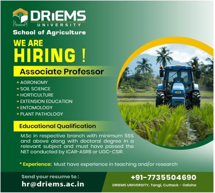 Advertisement for the recruitment of the Post of Associate Professor in School of Agriculture(SOA), DRIEMS University