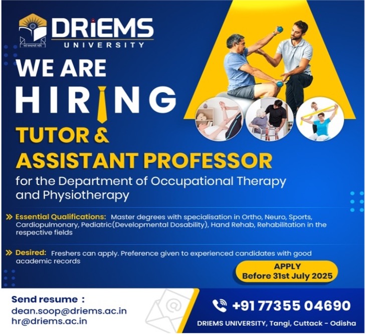 Advertisement for the recruitment of Tutor and Assistant Professor for School of Occupational and Physiotherapy(SOOP), DRIEMS University