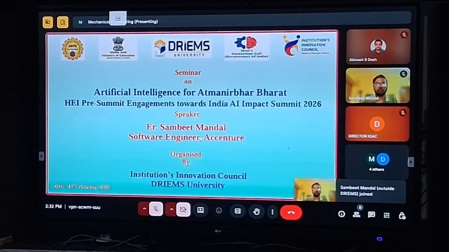 The Institution’s Innovation Council (IIC), DRIEMS University successfully organized a seminar on “Artificial Intelligence for Atmanirbhar Bharat” on 10th February 2026.