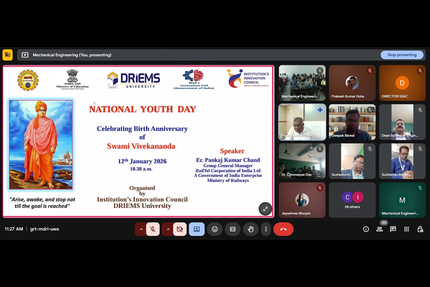 The Institution’s Innovation Council (IIC), DRIEMS University successfully celebrated National Youth Day on 12 January in online mode, commemorating the birth anniversary of Swami Vivekananda. The event featured an inspiring address by Er. Pankaj Kumar Chand, Group General Manager, RailTel Corporation of India Ltd., motivating students to embrace innovation, leadership, and nation-building. The programme began with the inaugural address by Hon’ble Vice-Chancellor Prof. Dr. Prakash Kumar Hota and was efficiently coordinated by Dr. Deepak Ranjan Biswal, Convenor, IIC, with active participation from faculty members and students.