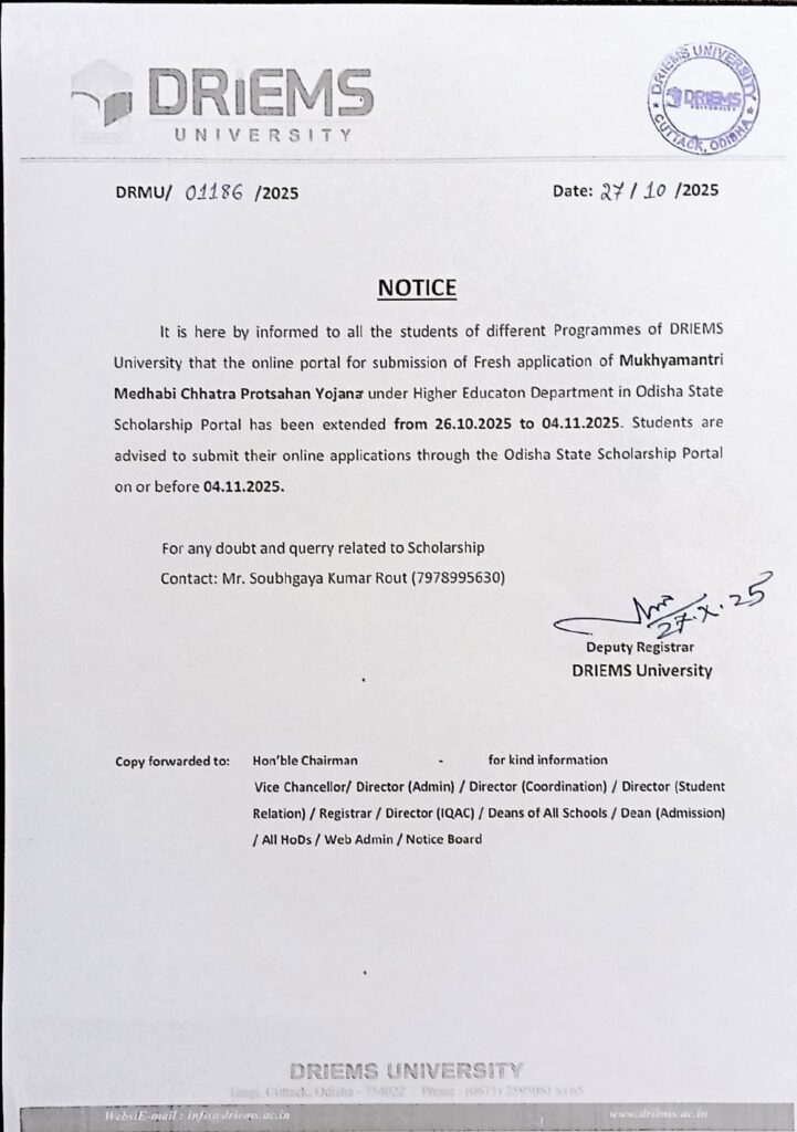 Date extension for submission of Fresh application of Mukhyamantri Medhabi Chhatra Protsahan Yojana 2025