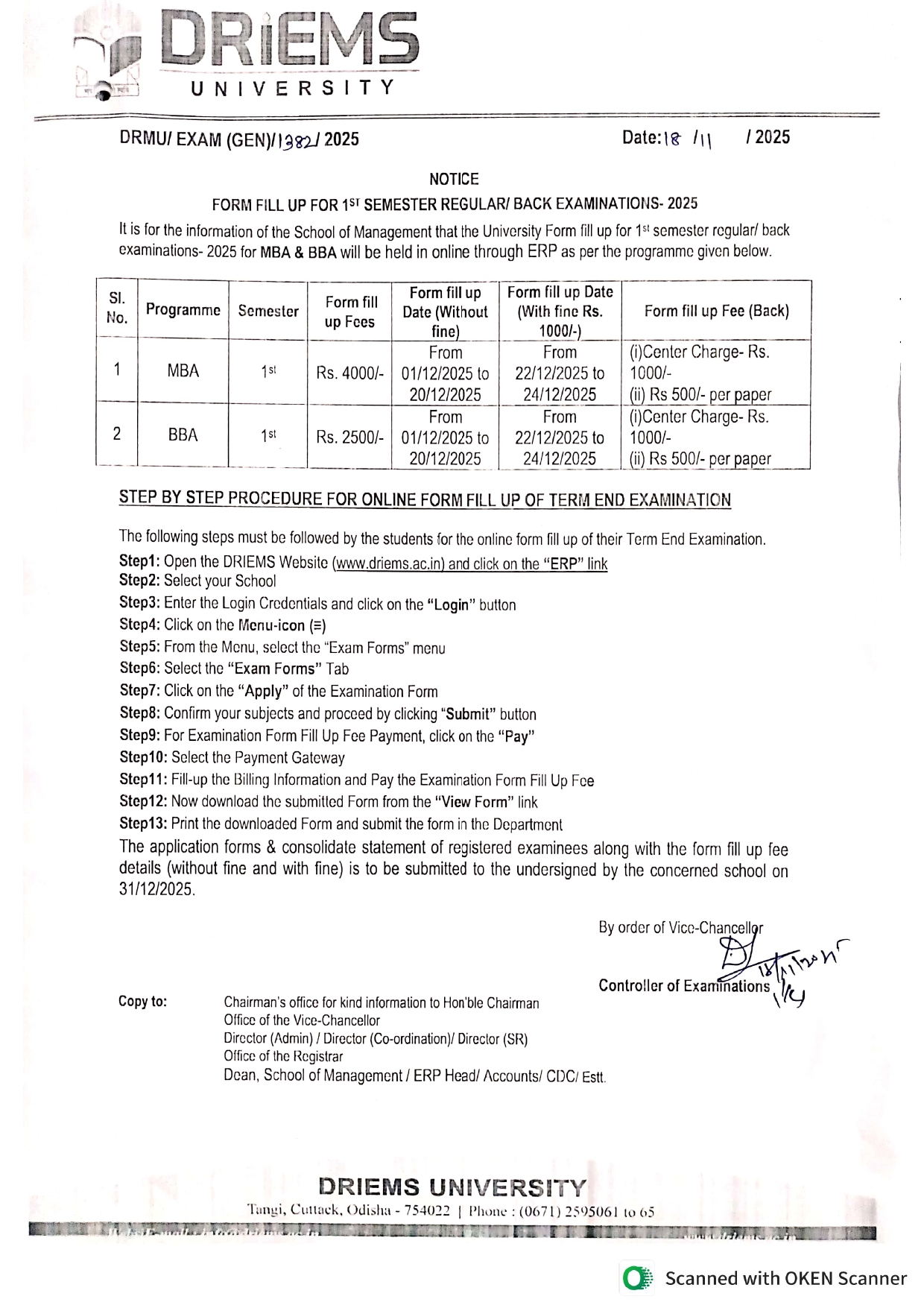 Form fill up notice for MBA & BBA 1st semester regular/back examination-2025