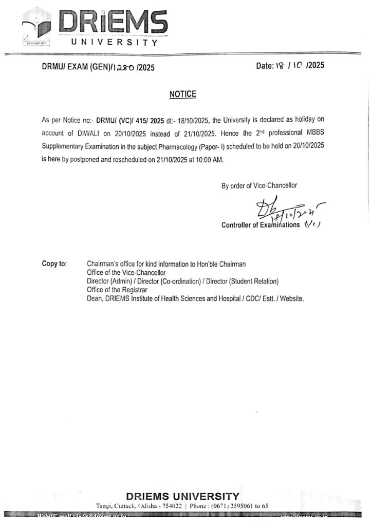 NOTICE FOR EXAMINATION DATE RESCHEDULED OF 2ND PROF. MBBS SUPPLYMENTARY EXAMINATION-2025
