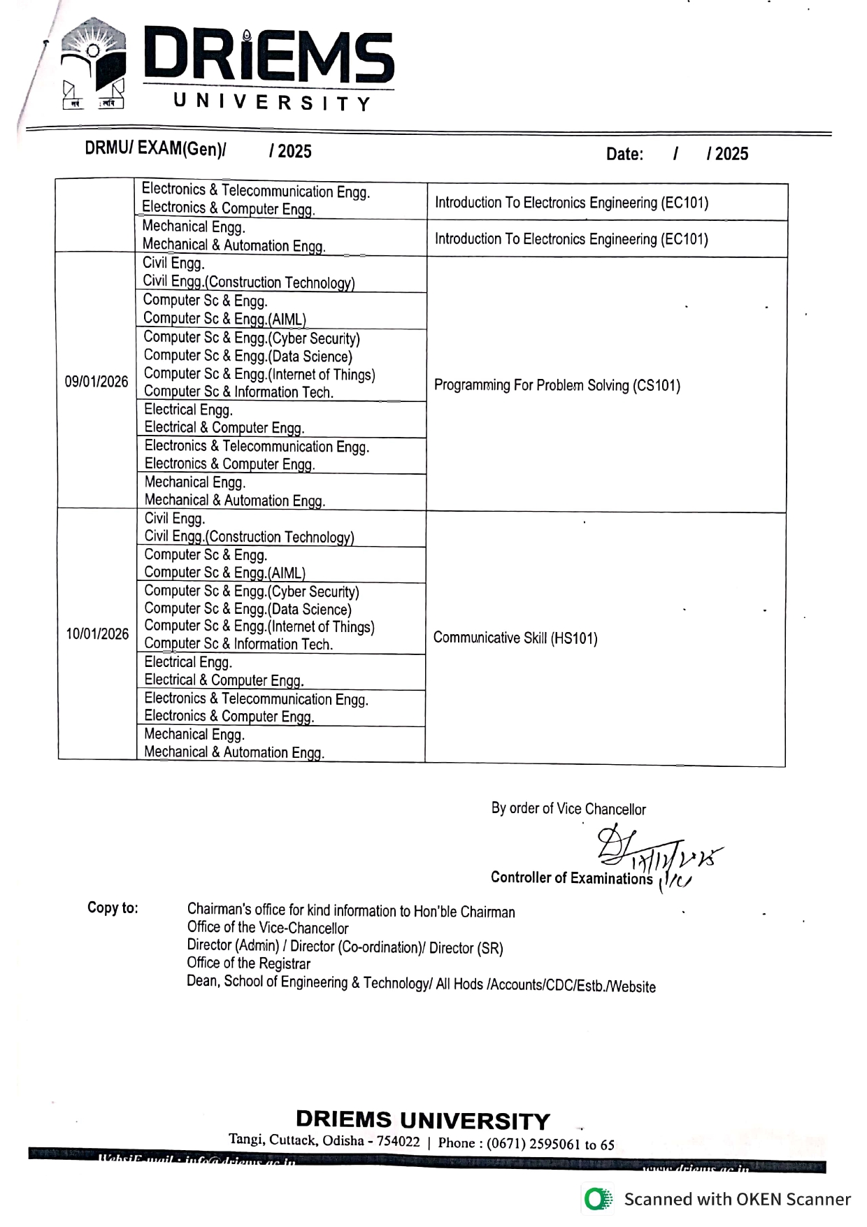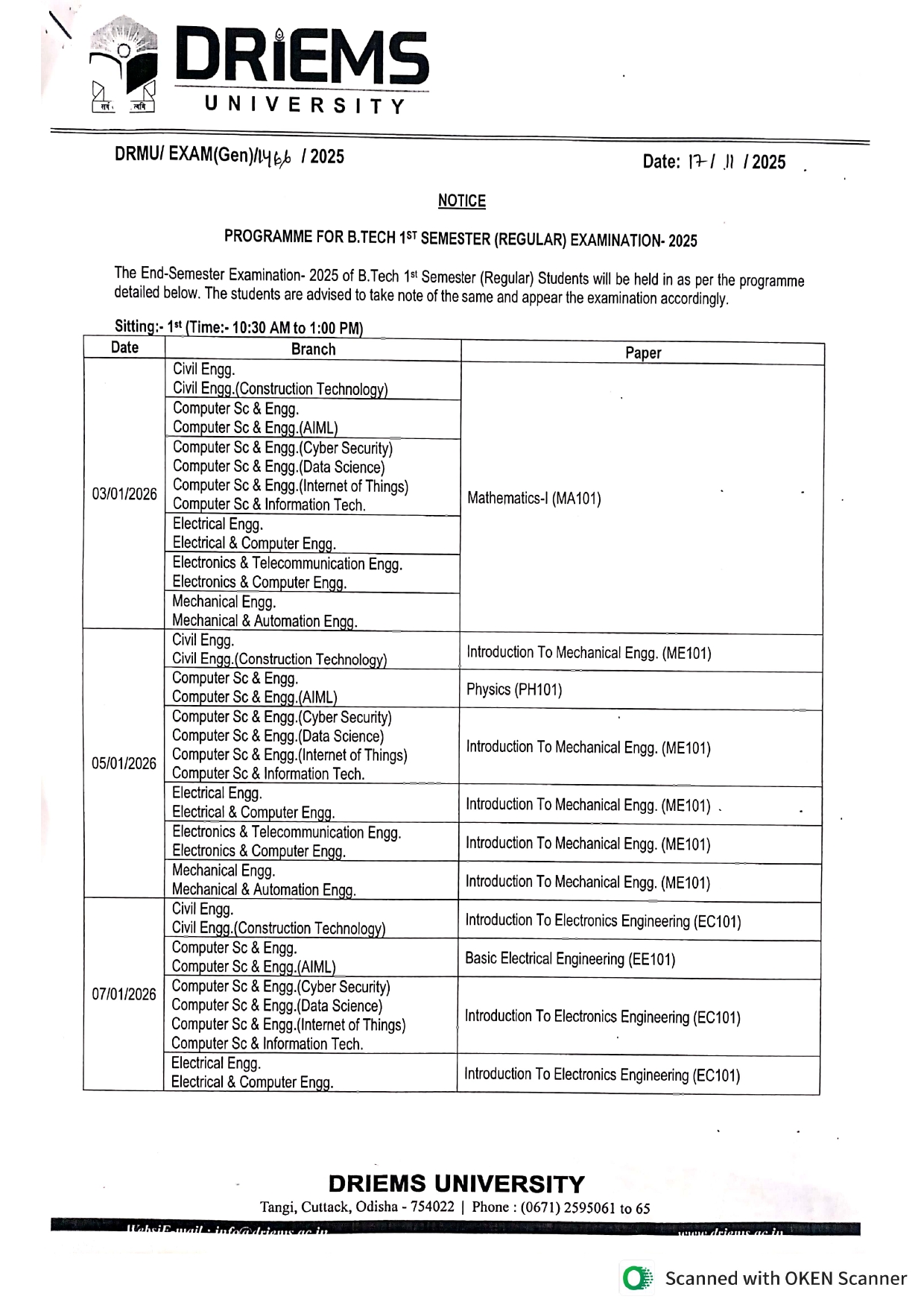 Programme for B.Tech 1st semester Examination-2025(Regular)