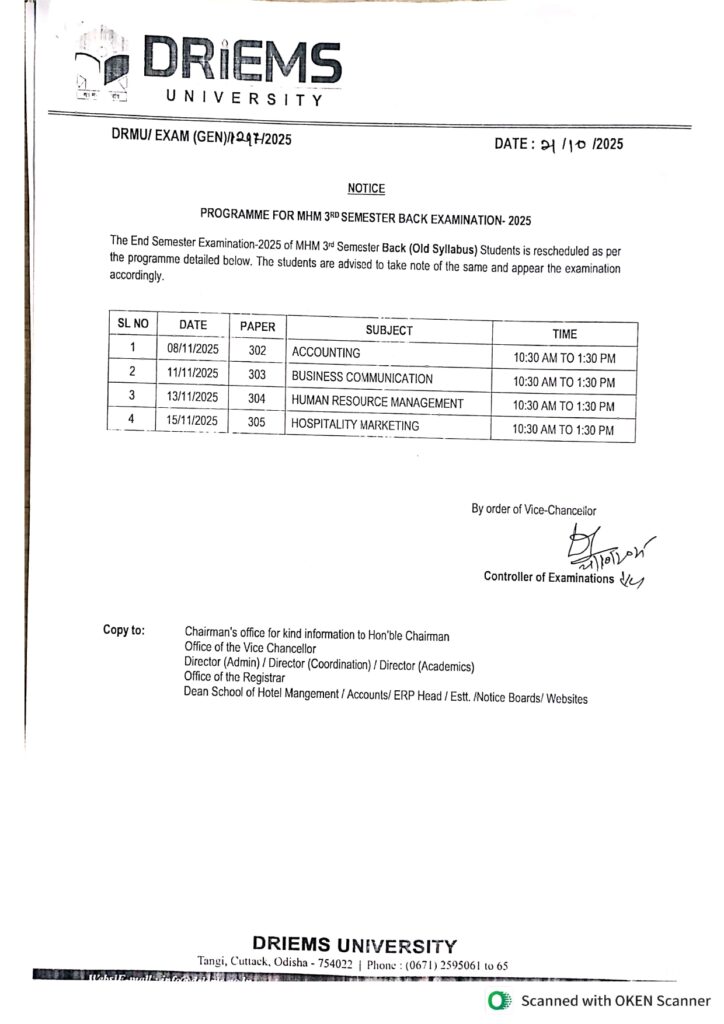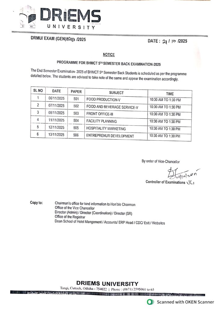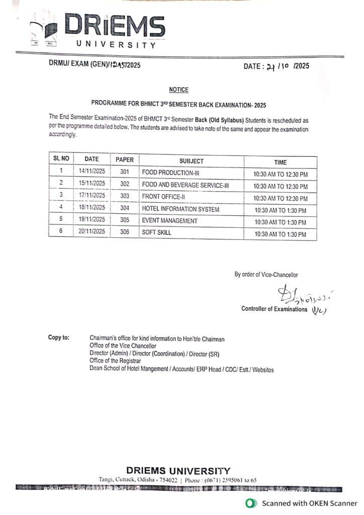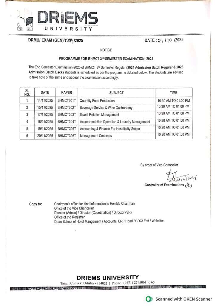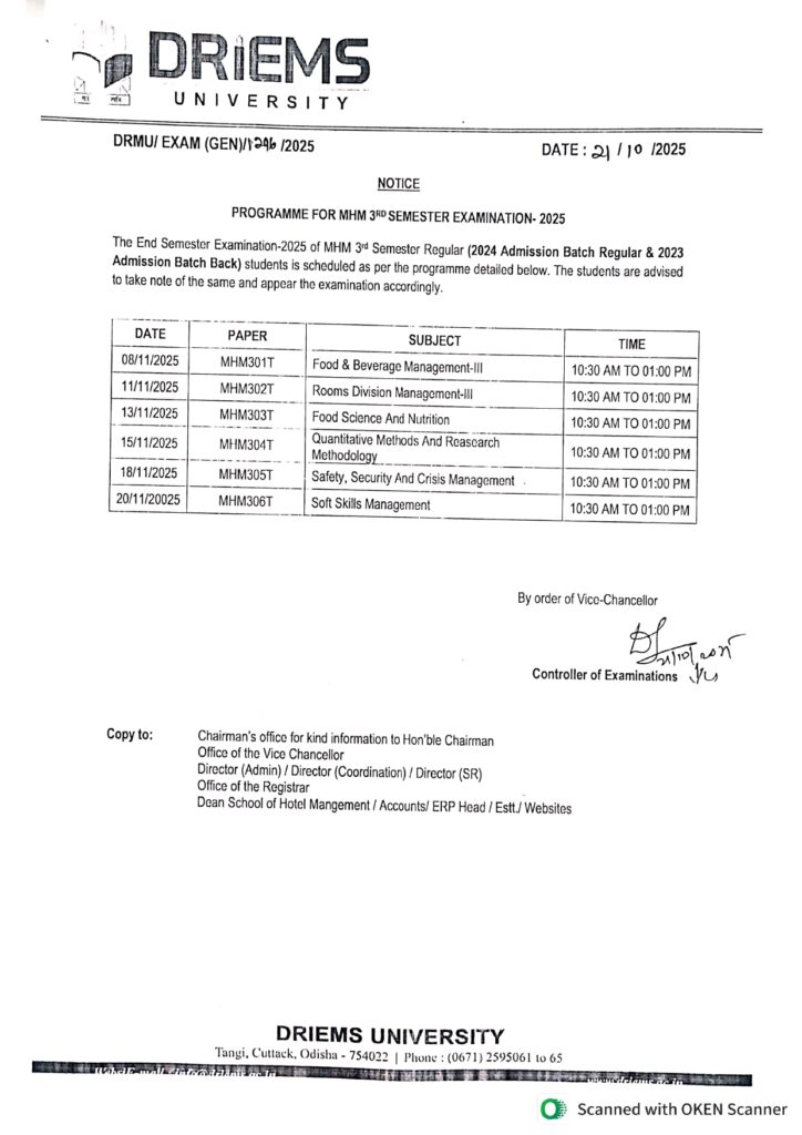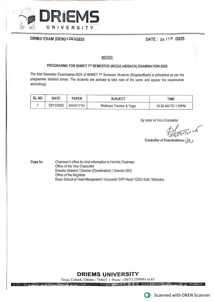 Programme for BHMCT 7th ,BHMCT 5th, BHMCT 3rd, & MHM3rd semester (Regular/ Back) Examination-2025