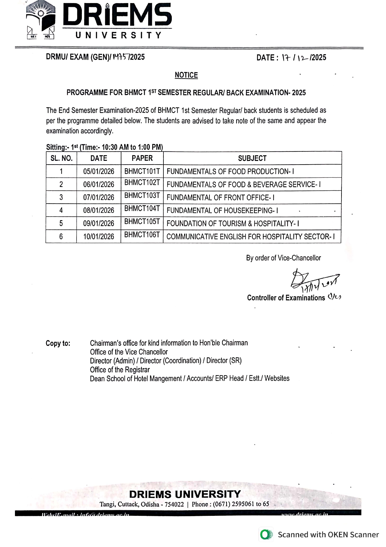 Programme for BMHM 1st semester Examination-2025(Regular/Back)