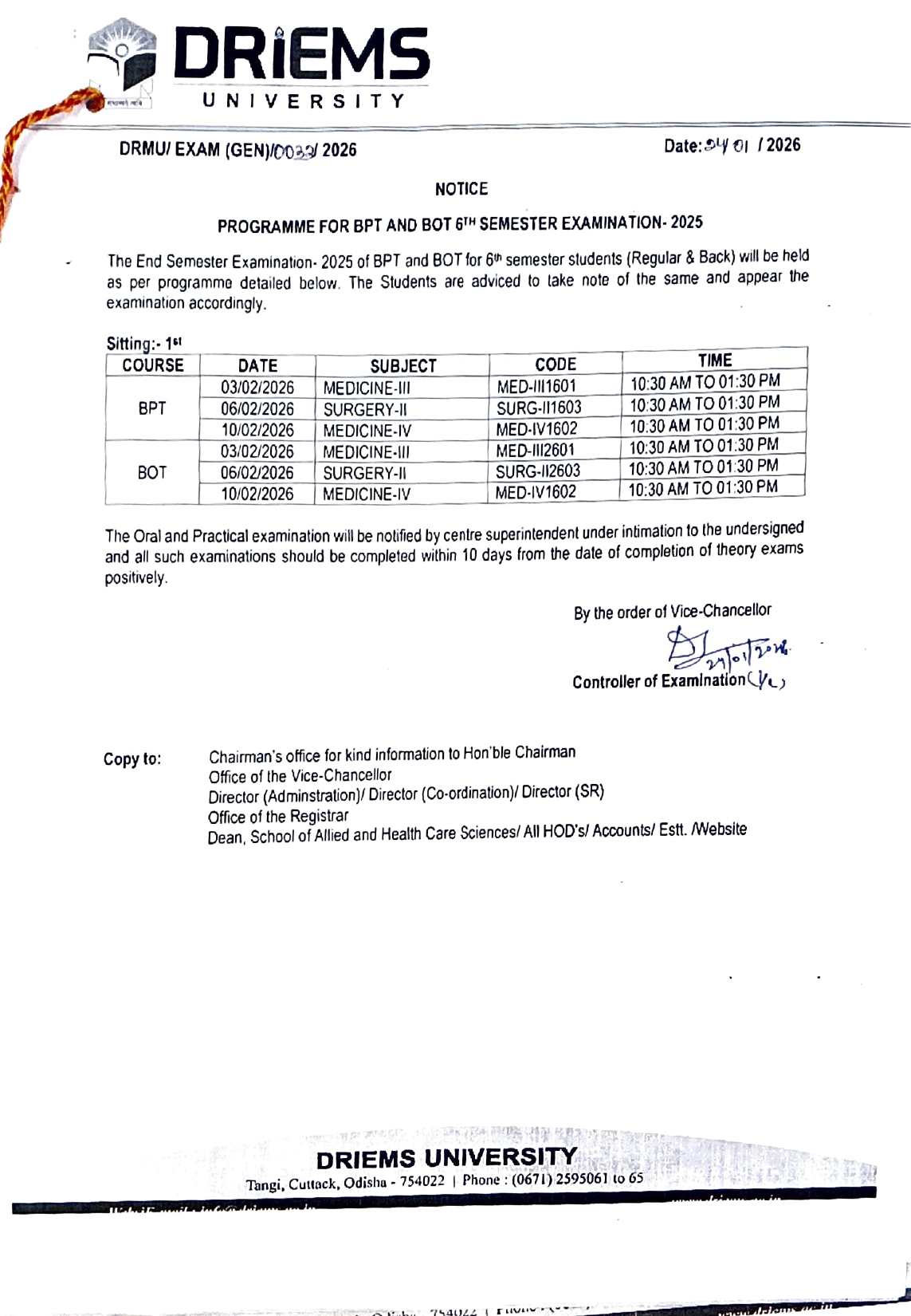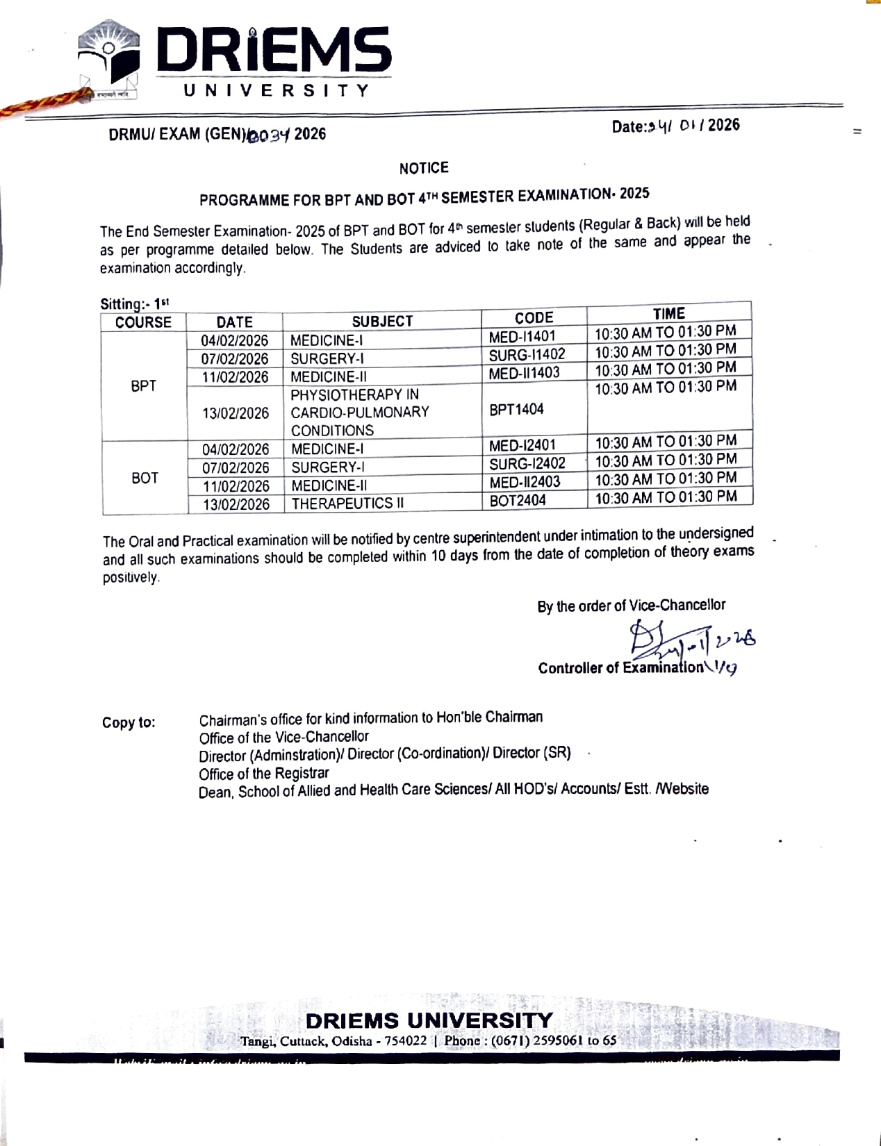 Programme for BPT,BOT 6th & 4th semester Examination-2025