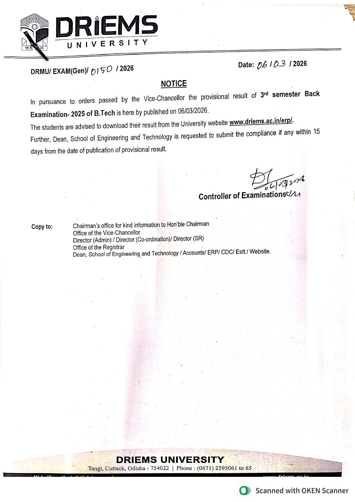 Exam Notice | SoNS Exam Notice Form fill up notice for Msc.(Phy .Chem. Math ) 4th semester Examination-2026 ByDRIEMS University March 6, 2026March 9, 2026