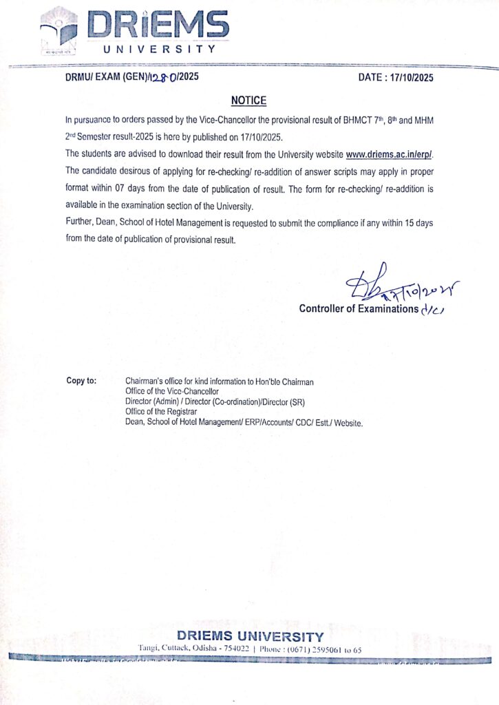 Result publication notice of BHMCT 7th, 8th & MHM 2nd semester examination-2025