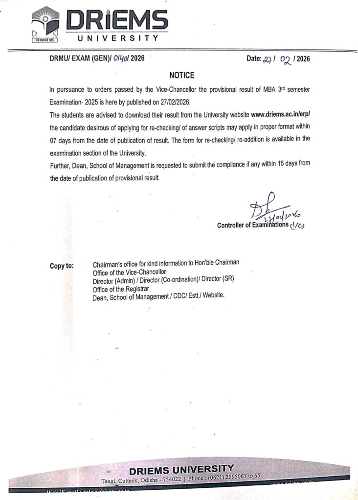 Result Publication notice of MBA 3rd Semester Examination-2025